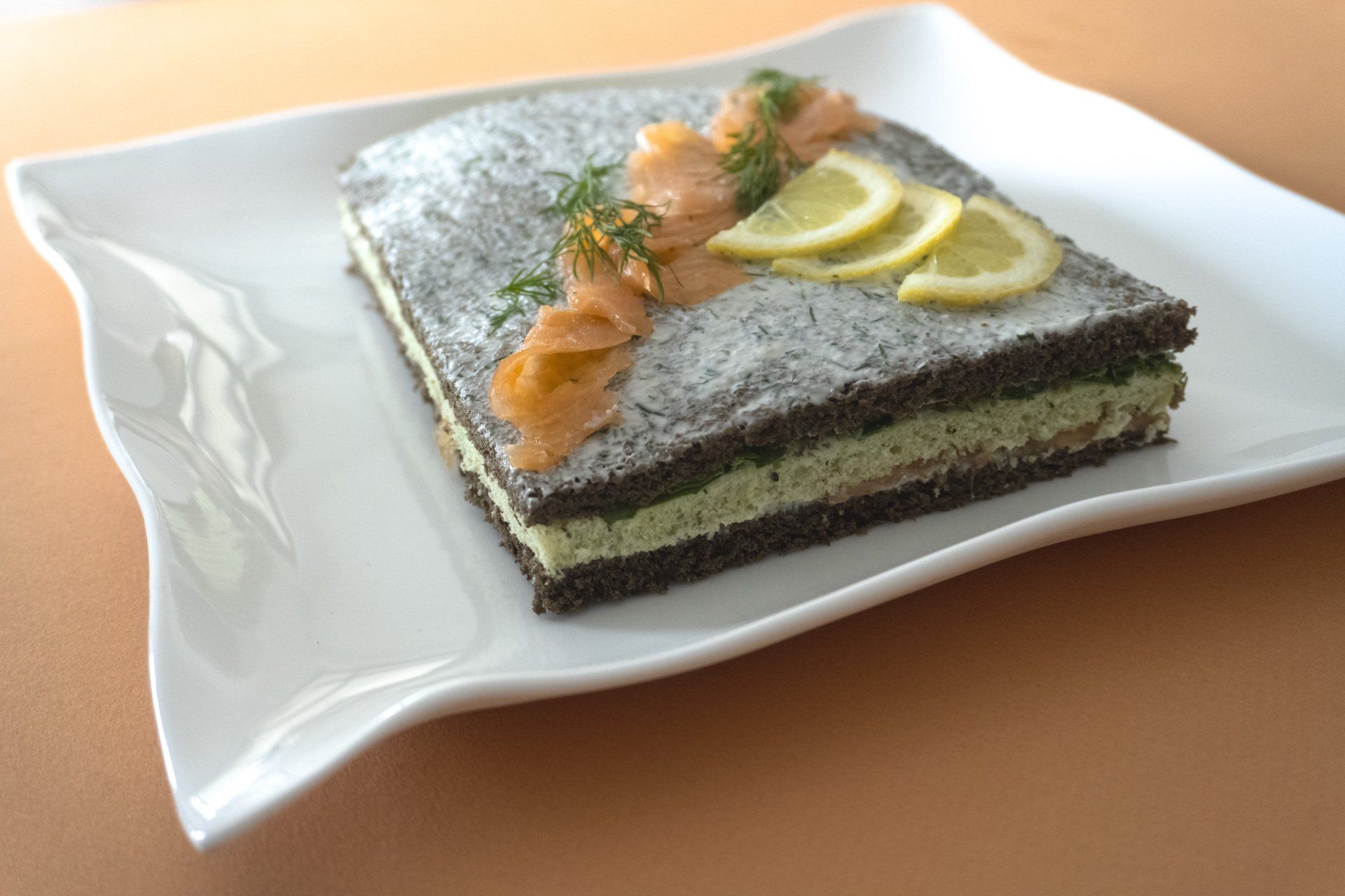 - Extienda su primera rebanada en una superficie plana Unte con la salsa de eneldo Cubra con una rebanada con sabor a pesto Coloque una rebanada de salmón ahumado Cubra con otra rebanada de tinta de calamar sabor Adorne la parte superior de este último con una capa delgada de salsa de eneldo, Decore con la resto de sus lonchas de salmón ahumado, rodajas de limón y eneldo fresco.